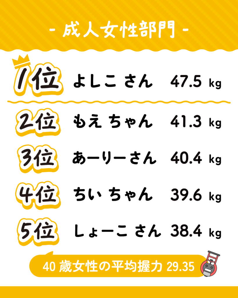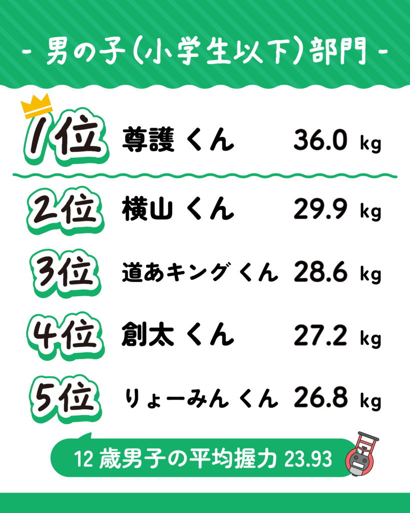 握力測定では、握力計の感触を懐かしむ人や平均値と比べて一喜一憂する人など、親子や友達同士で大いに盛り上がっていただけました。握力ランキングの結果は以下に掲載していますので、ぜひご覧ください。ランキングでは、成人男性1位のけんさんが連覇を達成されました!