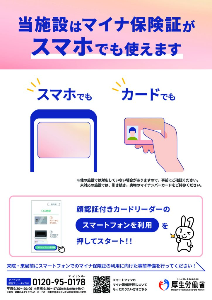 スマートフォンによるマイナ保険証の対応を開始いたしました。 従来のマイナンバーカードに加え、スマートフォンをスマホ用汎用カードリーダーにかざしてご利用いただけます。