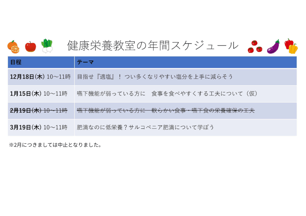 地域の皆さまを対象に開催しております「健康栄養教室」につきまして、年間スケジュールに一部変更がございます。 最新のスケジュールをご確認のうえ、ご参加いただけますと幸いです。