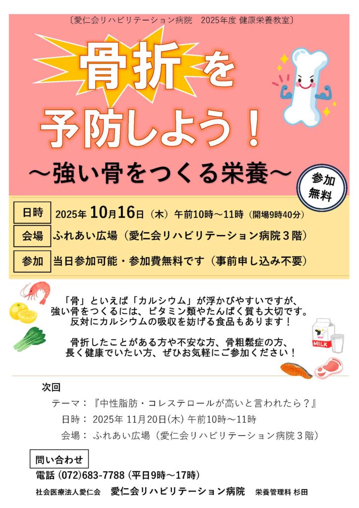 10月16日(木)の午前10時~11時に当院3階「愛仁会ふれあい広場」で「骨折を予防しよう!強い骨を作る栄養」をテーマに健康栄養教室を開催いたします。
