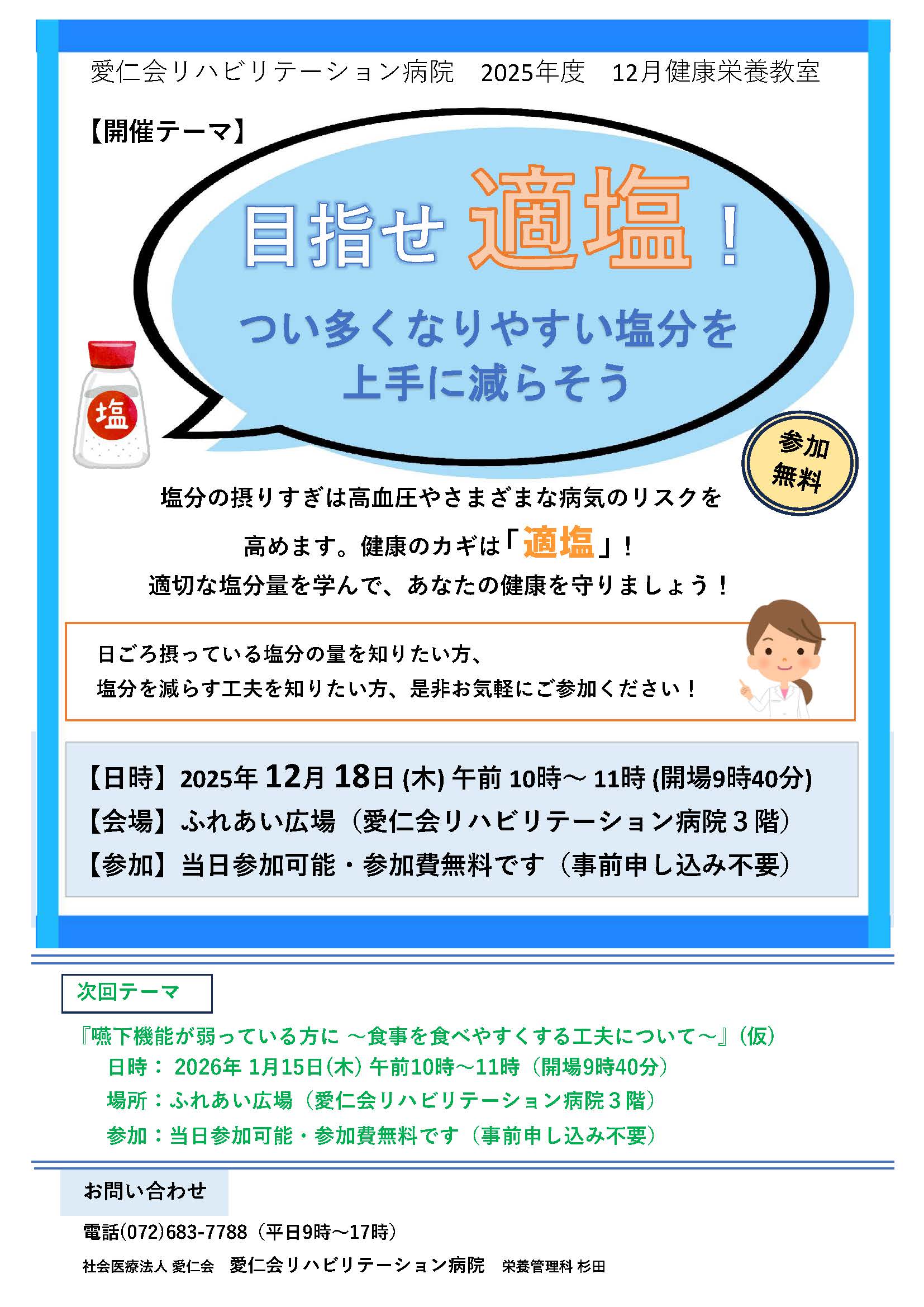 12月18日(木)の午前10時~11時に当院3階「愛仁会ふれあい広場」で「目指せ『適塩』!つい多くなりやすい塩分を上手に減らそう」をテーマに健康栄養教室を開催いたします。
